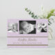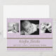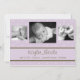 Cute lavender and brown Polka Dot birth announcement with a solid ribbon containing name and birth information.