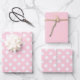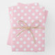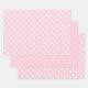 This pastel pink (#FFD1DC) wrapping paper set includes three coordinated sheets: two adorned with delicate white polka dots, and one in a solid pastel pink for a clean, modern contrast.