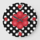 Fun round wall clock done in black with white polka dots. Graphics of a red flower, in the centre, with red and black ladybugs surrounding it, in place of the numbers on the clock. Customise to add text. Great clock for any age.