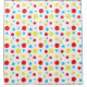 Assorted polka dots pattern shower curtain in colours of yellow, blue, and red on a white background.