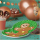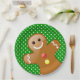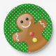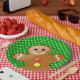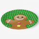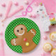 White polka dot pattern on a bright green with a large gingerbread man that had red and yellow gummy buttons.