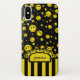 Cool tiny yellow coloured polka dot happy face pattern design on black. Retro stripe flower monogram ribbon, Personalise with your name.