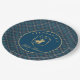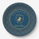 A preppy, classic hunter green and navy blue tartan plaid, checkered personalized paper plates to elevate your baby shower decor with equestrian and plaid elements with burgundy and gold tone accents. A family name crest with monogram and polo player silhouette with horse adorns the center and the tartan pattern adds a timeless touch. Perfect for an Old Money themed baby shower with a classic, vintage and luxurious feel. If you like grandpa core, vintage style this is a baby shower theme. Customize by adding your own initials or monogram and name.