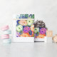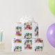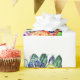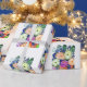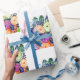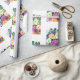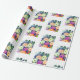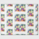 Decorated paper that is used to cover presents. Rosas orange, green and perpule with green leaves.