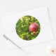 Photograph of a ripe pomegranate still clinging to a leafy green tree branch