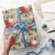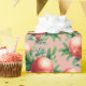Colourful pomegranate fruits with green leaves on a light peach background.