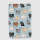Cute Pomeranian dogs in black, grey, cream, chocolate and red coats sit and stand with scattered dog bones and paw prints on a light blue background.
