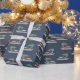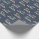 This patterned wrapping paper is perfect for Christmas. The gift wrap features illustrations of pontoon boots with a Christmas tree on top set against a navy blue background.