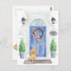 Announce your new address with our stylish announcement featuring a tan poodle, blue front door, welcome mat, slate sign, topiaries and a floral wreath set on a grey brick background.