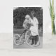 Old photo of cute little girl with toy poodle perched on her antique tricycle, 1910s.