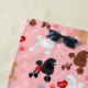 Cute Valentine's Day Poodles with in black, white, grey, apricot and brown colour coats wearing red, pink, and white polka dot and heart sweaters with scattered paw prints and arrow on a pink background.