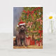This Christmas card features a watercolor portrait of a brown poodle wearing a Santa hat sitting under a Christmas tree.