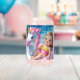 A cute young girl gently drifts on a pink and white unicorn float, gliding across a crystal-clear, blue swimming pool.