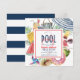 This cute 4th of July/Independence day "pool party" bridal shower invitation features a white background with a beach umbrella, flip flops, tropical mason-jar drink/cocktail, popsicle, watermelon, donut, pineapple, straw hat, fresh coconut drink, pinwheel and sunglasses. The reverse side features a white background with navy blue stripes. Personalize it for your needs. You can find more matching products at my store.