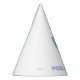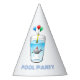 Party hat with a cute illustration of a little whale. The whale is wearing a red and white striped party hat and has started the birthday party which takes place in a filled water glass.