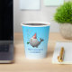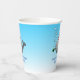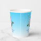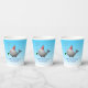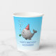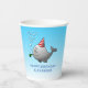 Pool party birthday paper cups with a cute illustration of a little whale. The whale is wearing a red and white striped party hat and has started the birthday party in the pool.
