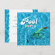 Customisable invitation template for summer pool party with clear blue pool water, snorkel and colourful text.