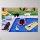 Cute and colorful Labrador Retriever Pool Party painting. Black Labrador, Chocolate Labrador, Yellow Labrador are all painted in the picture. Labradors are having a Pool Party in their beautiful garden!! Whimsical and funny Labrador Retriever Art painted by Naomi Ochiai. Labrador gifts for Labrador lover's home. Great fun gifts for yourself, too.