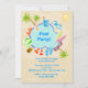 A generic pool party invitation well-suited for any summer celebration. The pool is framed with various items which make summer fun and has a sandy background.