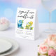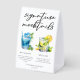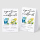 This chic poolside signature mocktails paper table tent sign features simple script above 2 beach wedding or pool party drinks and their ingredients for your coastal celebration. A cute Blue Lagoon drink and Mint Julep drawing for a refreshing summer reception. Complete with the couple's names and date.