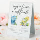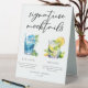 This chic poolside signature mocktails table tent sign features simple script above 2 beach wedding or pool party drinks and their ingredients for your coastal celebration. A cute Blue Lagoon drink and Mint Julep drawing for a refreshing summer reception. Complete with the couple's names and date.