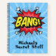 Choose from ten different page interiors - wide ruled, sketchbook, practice handwriting, graph paper, among many. This notebook can be personalised with your name and title and features a colourful pop art "POW" sticker and a green background, Great as a gift for back to school or as an end of year gift.