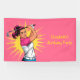 A vibrant pop art illustration of a young female golfer in action. She wears a bright pink shirt layered under a crisp white polo shirt, her stance confident as she prepares to swing a golf club against a dazzling, solid bright pink background. Her hair is styled in a playful ponytail, and she has a determined, yet cheerful expression, while the golf club is angled dynamically in her grip. The background features bold, repeating patterns and halftone dots typical of pop art, creating a sense of energy and movement surrounding the central figure.