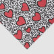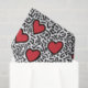 This vibrant pattern features bold, red hearts scattered across a white background filled with dynamic black doodles. The playful design, reminiscent of pop art, uses strong lines and whimsical shapes to create a lively and energetic visual. The juxtaposition of bright red hearts and abstract black strokes evokes a sense of love and spontaneity.