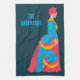 This personalised kitchen towel features an illustration of a 19th century woman wearing a bustle dress in bright pop art colours of bright blue, hot pink and yellow set against a navy blue background. The towel is ready to be personalised with a name or other text in bright blue lettering.