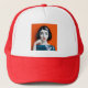 Stylised woman with red lips and striped shirt on orange background printed on red-and-white trucker hat, ideal for edgy streetwear and modern art lovers. This bold trucker hat features a glossy pop art portrait of a fashionable woman with a sharp black bob, vibrant red lips, and a cool blue-striped top. Set against a vivid orange background, her confident gaze and finger-to-lip pose add a touch of intrigue and attitude. With a bright red brim and breatheable mesh back, this cap blends comfort with iconic style—perfect for casual outings, creative streetwear, or as a bold gift for fans of modern fashion and expressive art.