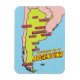 This illustrated map of Argentina is rendered in a vibrant pop art style. The map is outlined in black and filled with a bright yellow colour, set against a blue background with a dotted pattern. The major cities of Argentina are labelled in blue boxes.