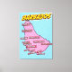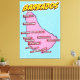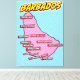 A pop art style map of Barbados with a bright blue background and a dotted pattern.