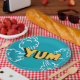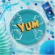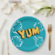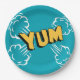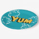 Paper plate with pop art design in blue and yellow.