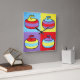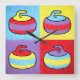 A playful celebration of color, texture, and repetition, this design presents a quartet of stylized curling stones rendered in a bold, painterly pop-art style. Each stone sits within its own vibrant color field, swapping hues and combinations to create a rhythmic visual variation that feels both cohesive and dynamic. The thick, hand-drawn outlines and visible brush-like textures give the forms a tactile, almost folk-art warmth, while the simplified shapes and high-contrast palette lend a modern, graphic punch. The result is a lively, whimsical composition that captures the spirit of curling through a lens of cheerful abstraction and expressive color.