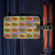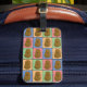 Fun colourful pop art style luggage tag with a pattern of different coloured rectangles each with a happy brown potato in the middle.