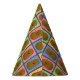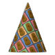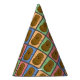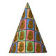 Fun colourful pop art style party hats with a pattern of different coloured rectangles each with a happy brown potato in the middle.