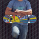 Cosmic rays from a sunburst in space, that's the feature on this skateboard. It's hand drawn and digitally coloured. The artwork by LyricalSixties is unique, and was inspired by space time travel. The colours are bright primary - red, yellow and blue.