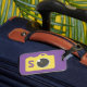 Bold and striking pop art camera design in bright yellow with background colour available to customise.