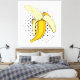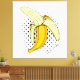 Funky modern wall art print of a peeled yellow banana fruit over black half tone dots. There's customisable text underneath for you to add names or a quote