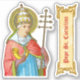 St. Cornelius was a third-century pope who reluctantly ascended to the chair of St. Peter in the aftermath of the Decian persecutions. Decius had required verified public sacrifice to the Roman gods and for his--the Emperor’s--well-being of all inhabitants of the Empire except the Jews who were exempted. Some Christians went to their deaths rather than meet the requirement; others either fled or gave in to save their lives. As the persecution abated, the Church was confronted with a seriously divisive issue: Were the Christians who had lapsed to be forgiven or were they forever after to be excluded from fellowship and the sacraments? Novatian, a church leader who had been passed over for the papacy, argued for exclusion; Cornelius, with the backing of the Synod he called, for penance and forgiveness. + Here, St. Cornelius wears the three-tiered papal crown or triregnum and long red cope or ‘mantum’ lined in green over a bright blue tunic and white alb. He carries the papal cross with its three horizontal beams of decreasing length from bottom to top in his left hand. At one and the same time, the three bars represent the Holy Trinity and the World, the Church, and Heaven. In his right hand, he carries a battle or hunter’s horn, his principal attribute since the name “Cornelius” in Latin means “battle horn”. Because his horn resembled ear trumpets used by the hard of hearing, St. Cornelius came to be invoked by persons with ear ailments. In the arts--both fine and devotional, the iconography of this pope saint is remarkably consistent making him readily identifiable. + Persecutions resumed under Trebonius Gallus, the subsequent emperor, when plague broke out in Rome. Christians became scapegoats for the disaster. Pope St. Cornelius died in exile in 253 either from the rigours of his banishment or from decapitation. He is patron of epileptics, earache sufferers, and domestic animals. + Feast: September 16 + Image Credit (SAU 042): Figure extracted from an antique image of Pope Saint Cornelius from a late 19th-century devotional print in chromolithography, originally published by the Socièté de St. Augustin, Bruges, Belgium, from the designer’s private collection of religious ephemera.