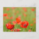 Postcard of vibrant red poppy flowers in a green field full of poppies. It has a strong emotion of hapiness, spring and summer.