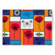 Colourful boxes and hand drawn poppies, daisy and butterfly, seamless vector pattern