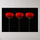 This beautiful poster for lovers of poppies features a photograph of three slender red Iceland poppy flowers shown against a dramatic black background. The red flowers with delicate petals stand upright on fragile green stems. The poster would make a dramatic statement in any room and great for emphasising red accents in your decor.