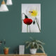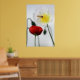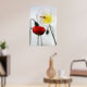 Our beautiful poster print for people who love flowers, especially poppies, features a photograph of a vibrantly coloured small red Iceland poppy that has just newly bloomed and a large white Iceland poppy with yellow centre. An orange and yellow hover wasp is on the white poppy. In the background of the photograph, there are silhouettes of poppies about to bud, with the stems of the young plants bending under the weight of the new buds. The photograph was taken in my garden. I grew the poppies from seed and am delighted with the results! The poster would make a colourful and bright, happy addition to any room of the home, including study, bedroom, living or dining room.