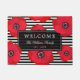 Chic welcome mat with red poppies against black and white stripes. Add your family name and year established.