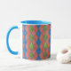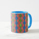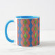 A chic Ringer Coffee Mug with a Powder Blue lip and handle and a Faux-patchwork pattern of diamond shapes in Poppy Red, Leaf Green and Royal Blue. Part of the Posh & Painterly 'Poppy Fields' collection.
