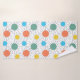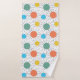 This towel set has an orange washcloth, a turquoise hand towel, and a bath towel with a mid-century modern design of circles with lines behind in orange, yellow, turquoise, and green.