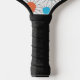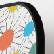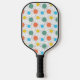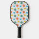 This pickleball paddle has a mid-century modern design of circles with lines behind in orange, yellow, turquoise, and green.