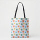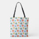 This tote bag has a mid-century modern design of circles with lines behind in orange, yellow, turquoise, and green.
