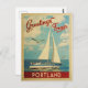 This Greetings From Portland Maine vintage travel nautical design features a boat sailing on the water with seagulls and a blue sky filled with gorgeous puffy white clouds.